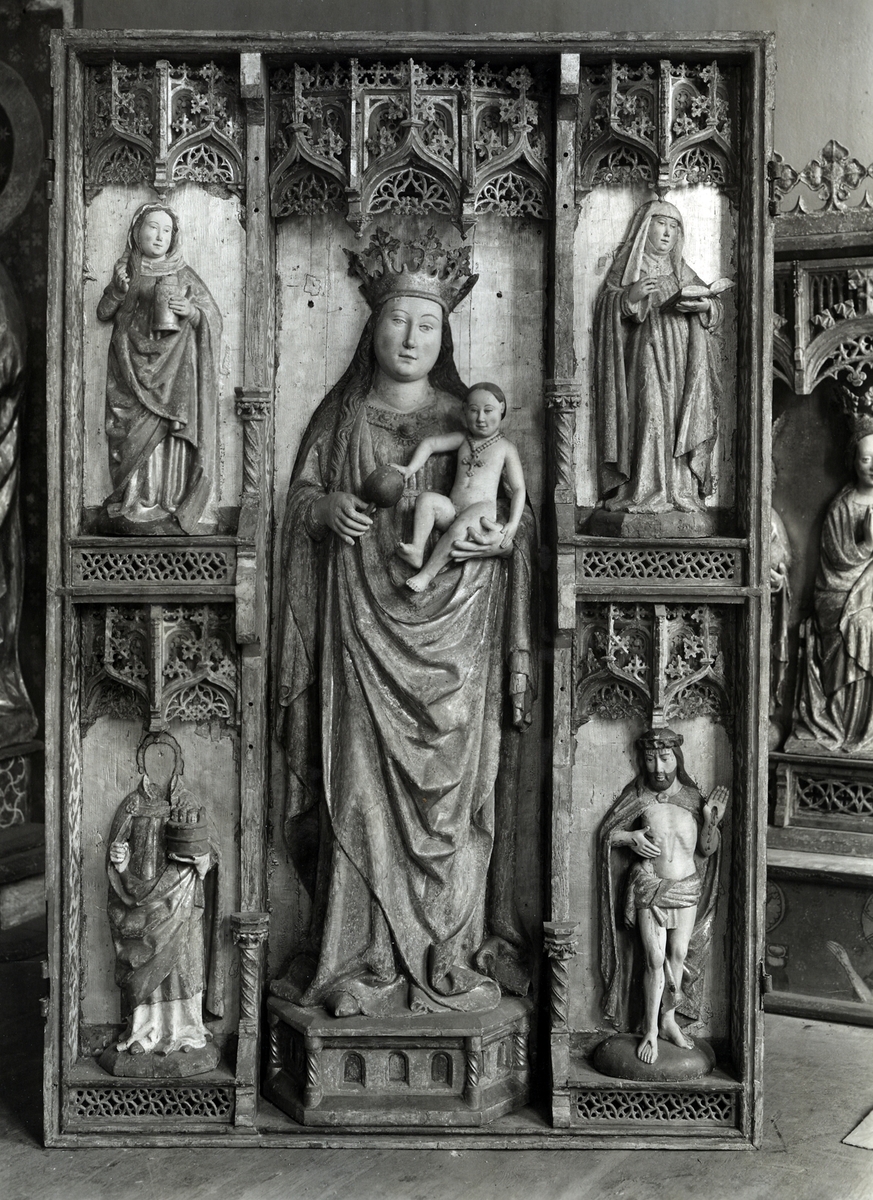 Det mindre altarskåpet efter restaureringen. Skall vara krigsbyte från Elbing och skänkt av en Bagge på Berga.