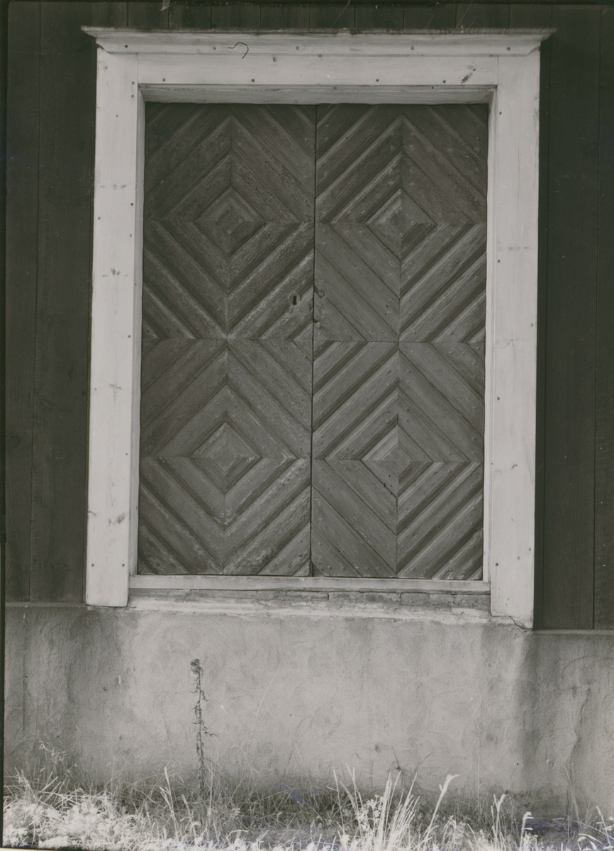 Ytterdörr till stuga. Ägare 1937 Karl Johansson. Bredd inom karm 1,30 m. Höjd inom karm 1,75 m. Med listverk i rutmönster. På stugans sydöstra långvägg.