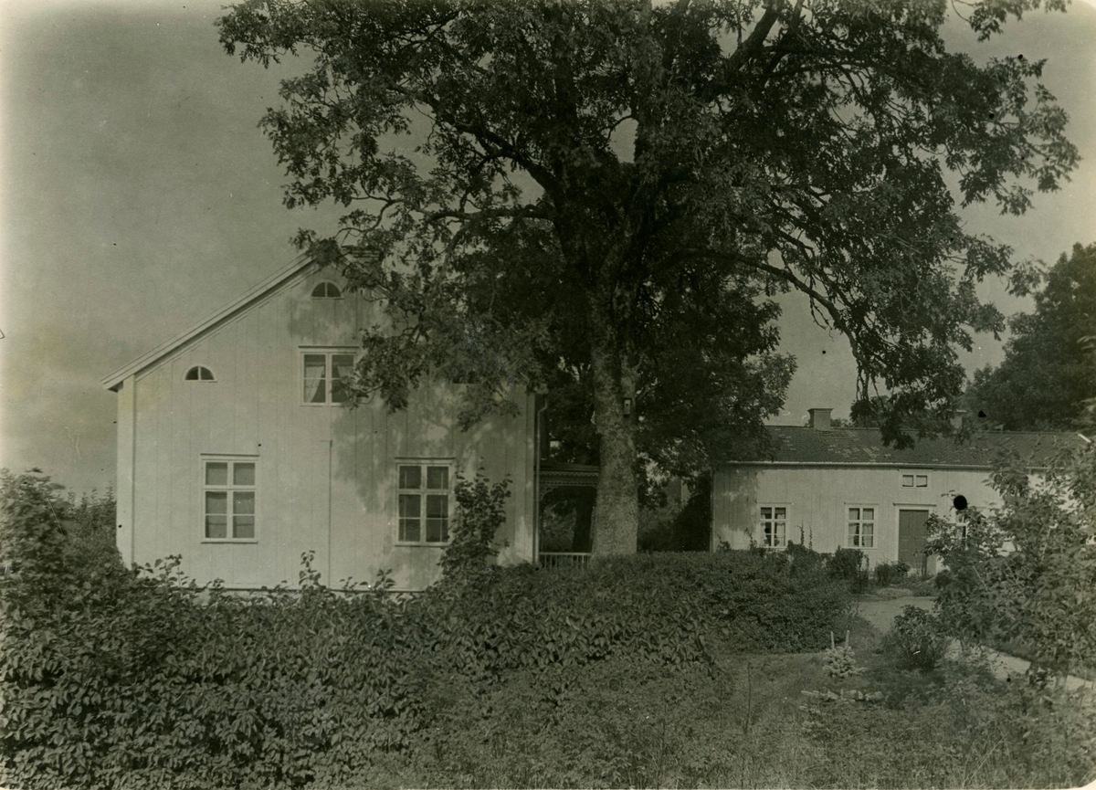 Mangården: Till vänster huvudbyggningen. Korsknutat timmer. Panelade vitgula väggar. Tegeltak. Sexdelad plan: