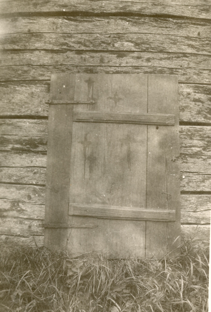 Ladugårdsdörr med tjärkors, som enligt folktron skulle hindra att onda väsen inte tog sig in.