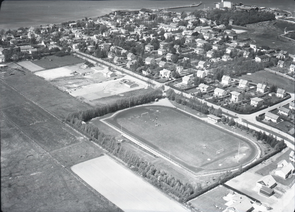 Flygfoto över Mörbylånga. Samhället med fotbollsplan, hus och vägar.