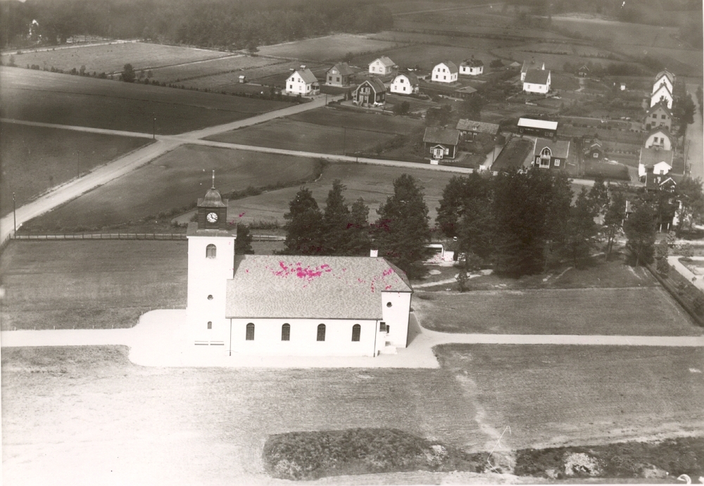 Flygfoto över Hultsfreds kyrka.