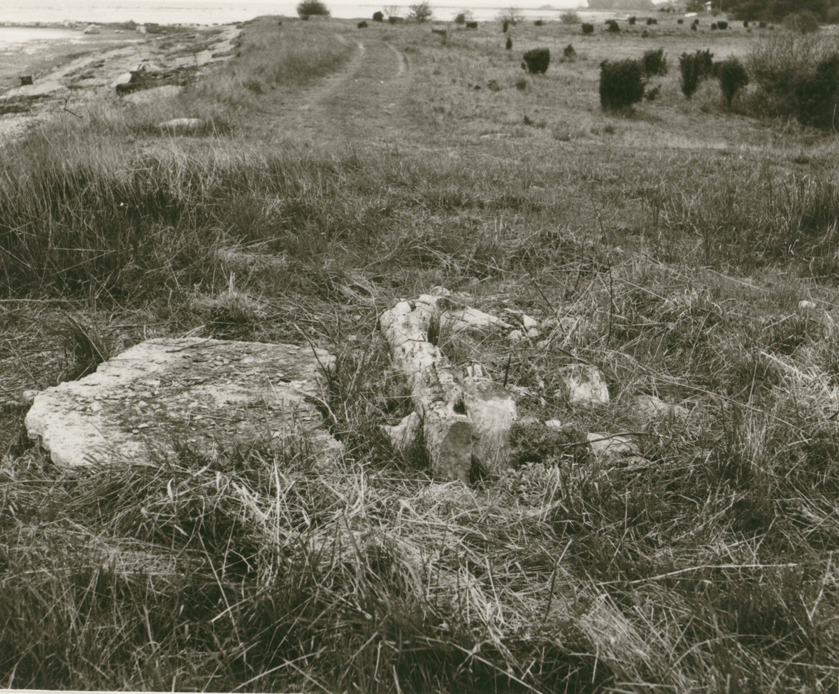 Till vänster avbruten milsten från söder. Fornlämning i ett odlingslandskap.