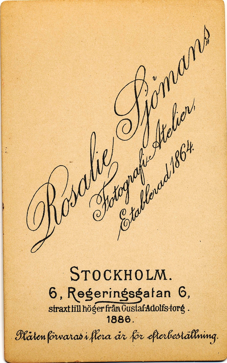 Text på fotots baksida: "Rosalie Sjömans Fotografi-Atelier, Etablerad 1864. Stockholm. 6, Regeringsgatan, 6, straxt till höger från Gustaf-Adolfs torg."