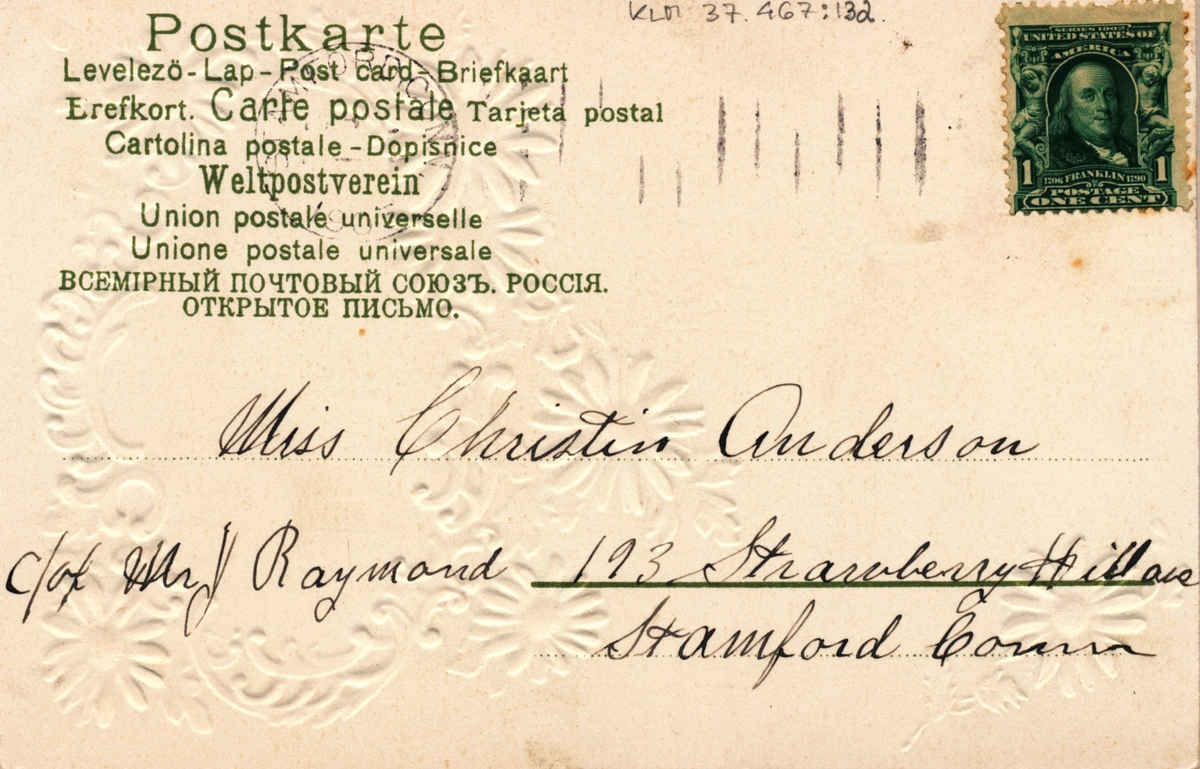 Ett vykort till Christina Andersson, c/o Mr Raymond, 193, Strawberry Hill Ave. Stamford, Conn.
