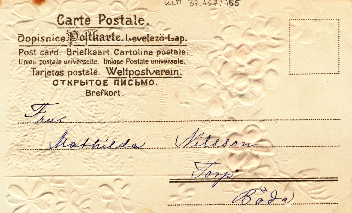 Ett gratulationskort till fru Mathilda Nilsson, Torp, Böda från Robert Nilsson.