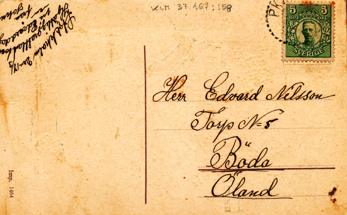 Ett gratulationskort till herr Edvard Nilsson, Torp no 5, Böda, Öland. "Stockholm den 17/3. Hjärtlig gratulation på Edvarddagen från John."