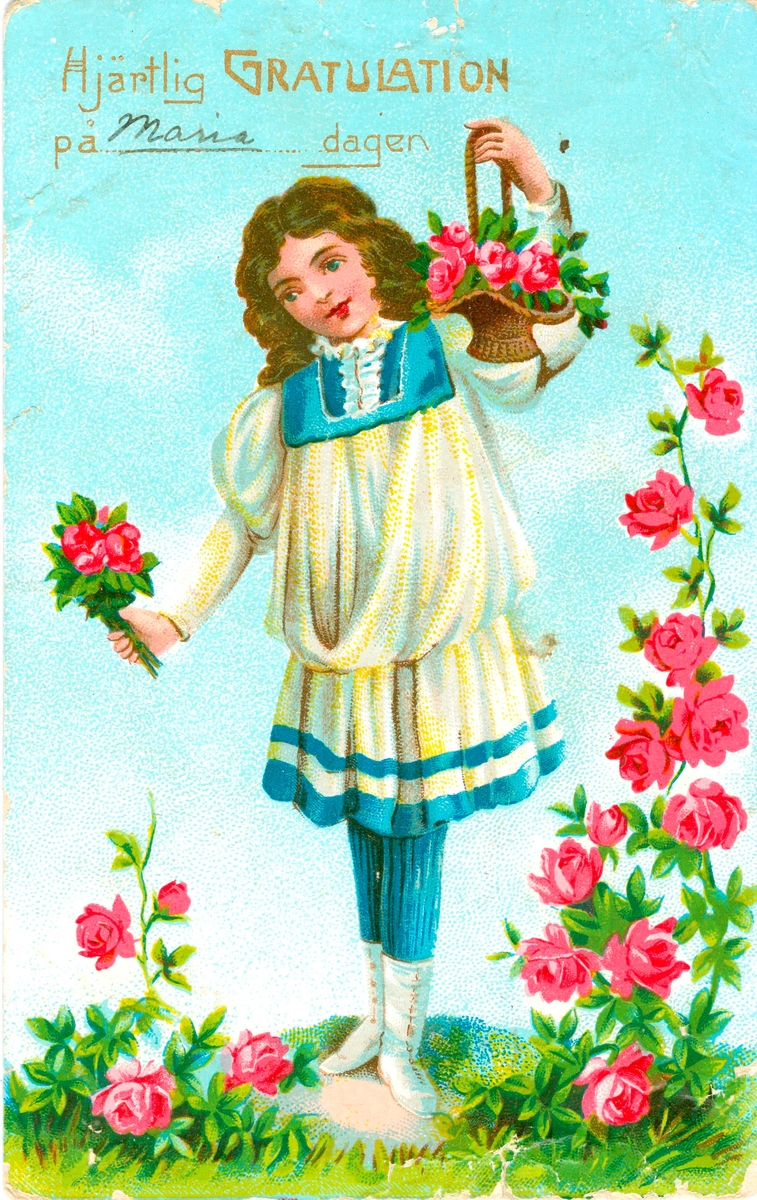 Ett gratulationskort på Maria-dagen till Karin Maria Andersson, Bremergatan 11, Kalmar från mormor och morfar med flera.
