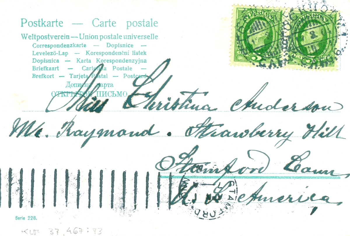 Christina Andersson, Stamford, Connecticut, USA, från Edvard Nilsson i Böda. Kortet är stämplat i Stockholm