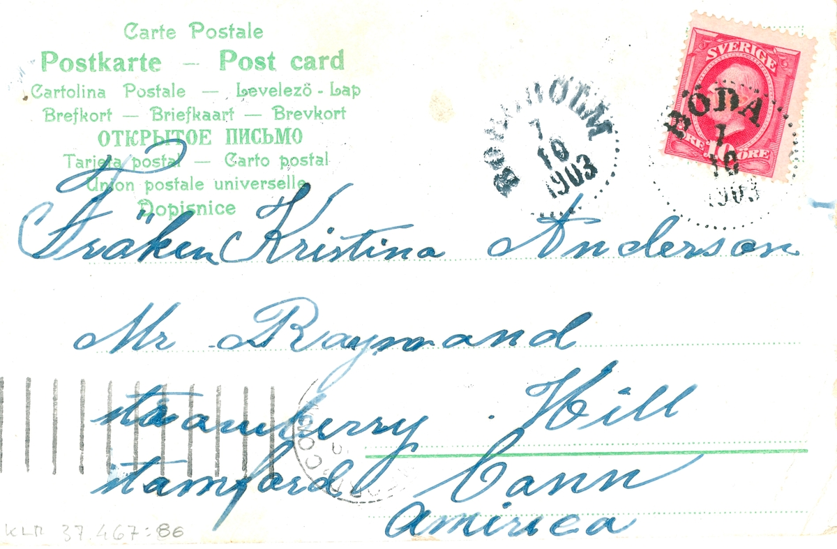 Ett vykort till Kristina Andersson, Stamford, Connecticut, USA. Det är skrivet av Edvard Nilsson i Böda,