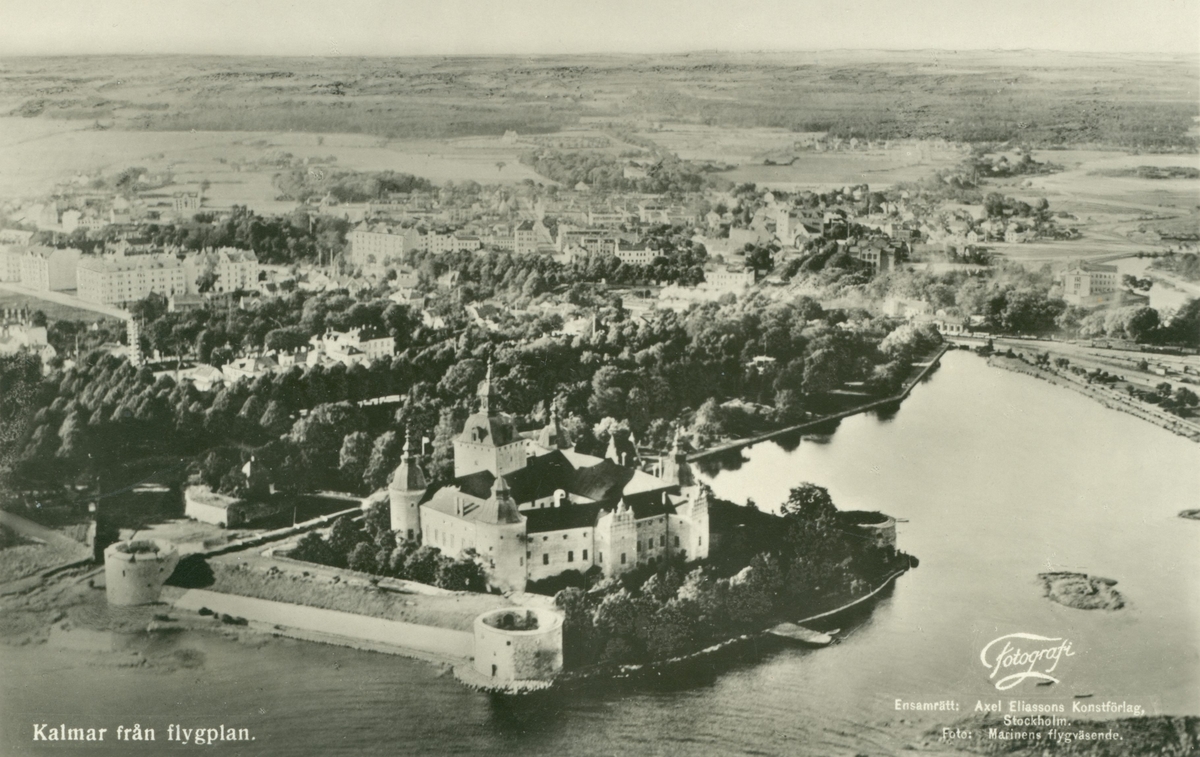 Flygfoto, utsikt över gamla staden och slottet i kalmar.