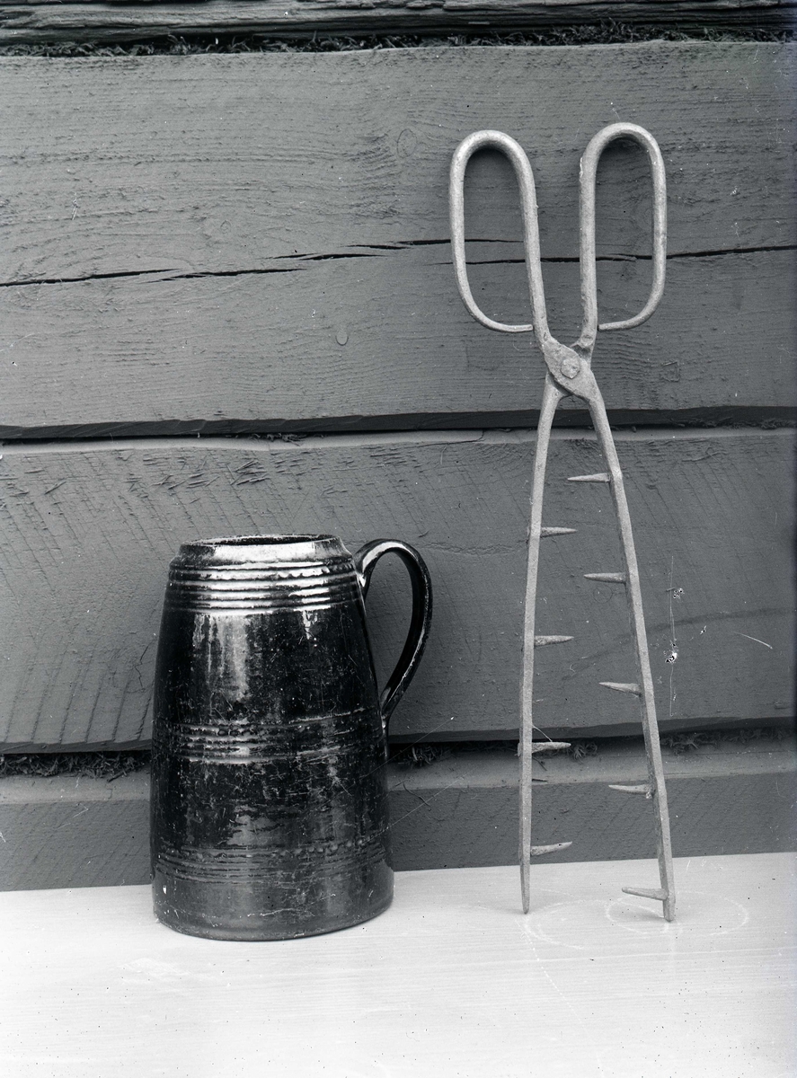 Två föremål; en sejdel och en vedtång.