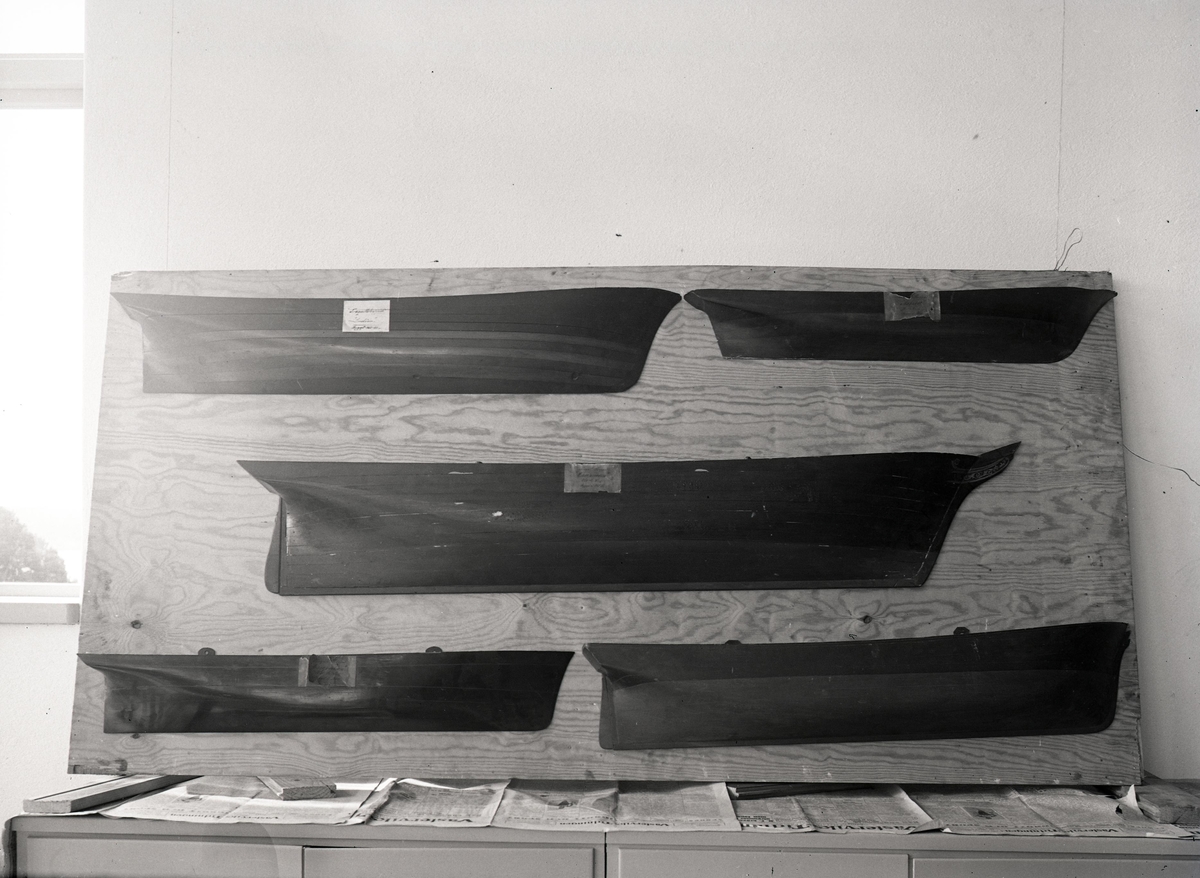 Bilden föreställer modeller av fem stycken fartygsskrov.