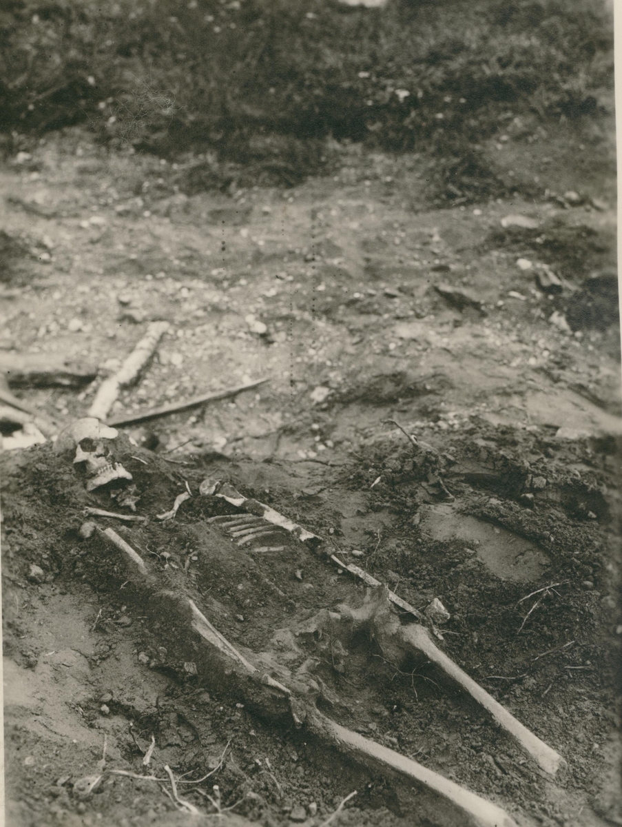 Gravundersökning 1938. Fynden bestod av skelett och spjutspets.