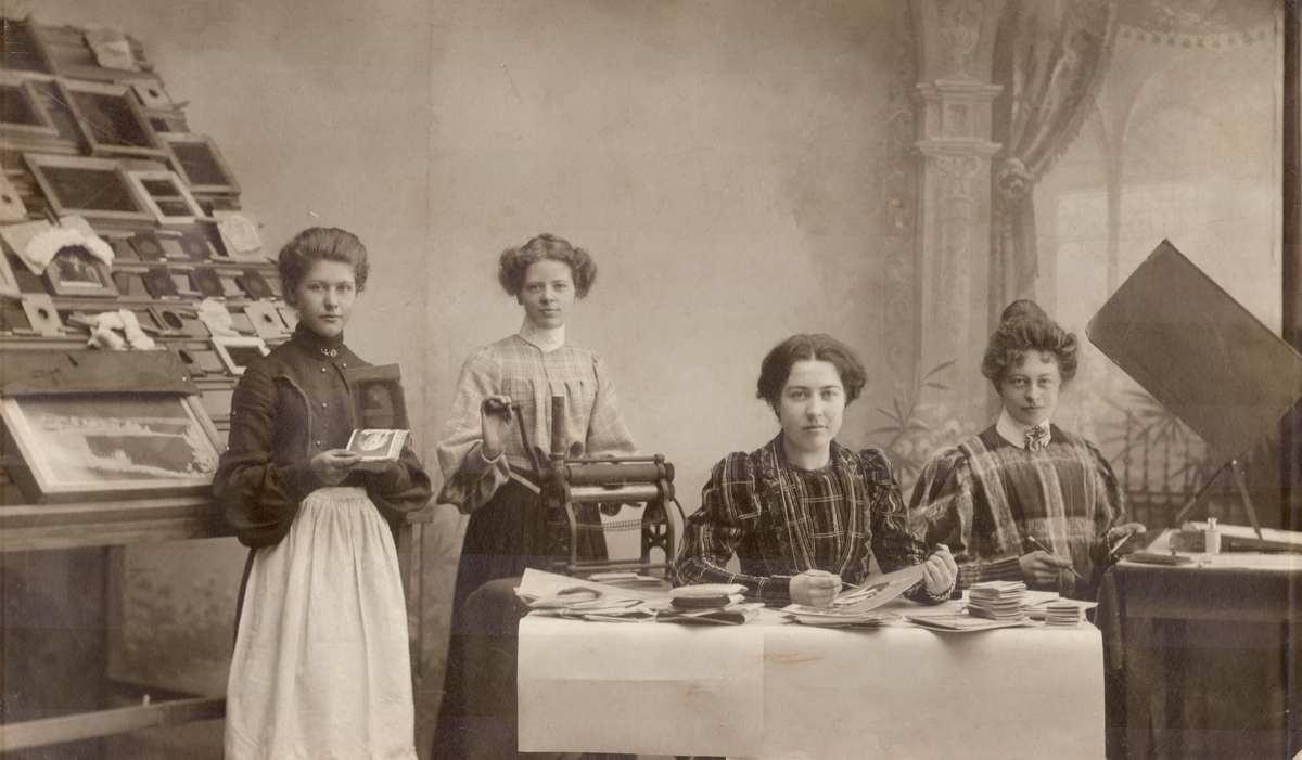 Fyra unga flickor, Ellen Warholm längst t.ill höger, och tre arbetskamrater i retuscheringsateljé.