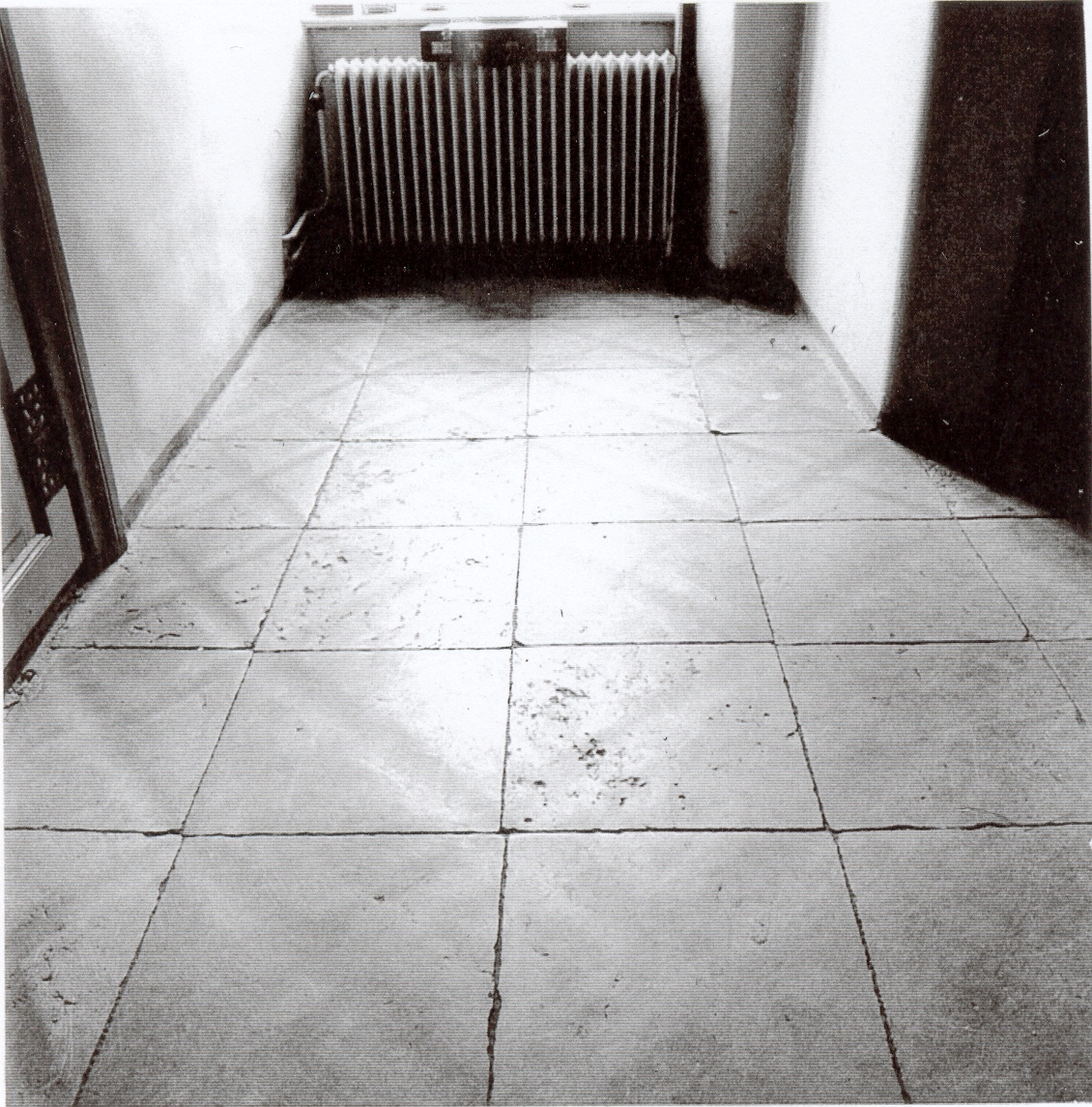 Kritat stengolv i nedre förstugan i en fastighet på kvarteret Gästgivaren.