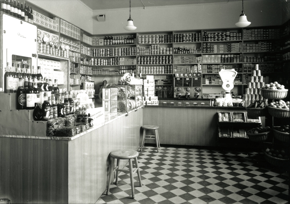 Interiör av speceriaffär. Fotot beställt av Arvid Nilsson.