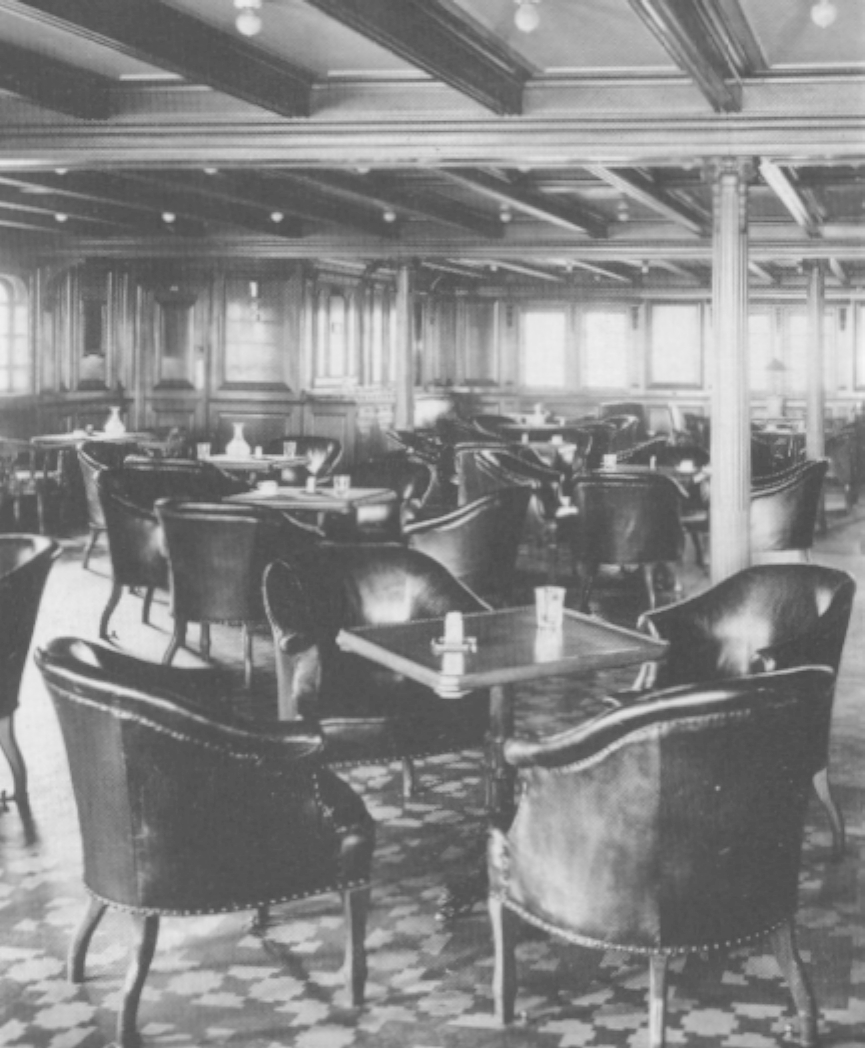 Röksalong med ekpanel och mörkgröna läderfåtöljer. Obsevera glödlamporna och