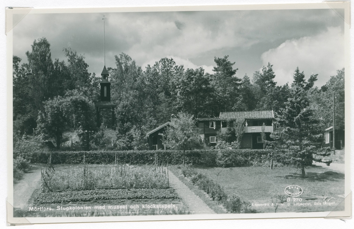 Vykort med Mörtfors stugkoloni med muséet och klockstapeln.
