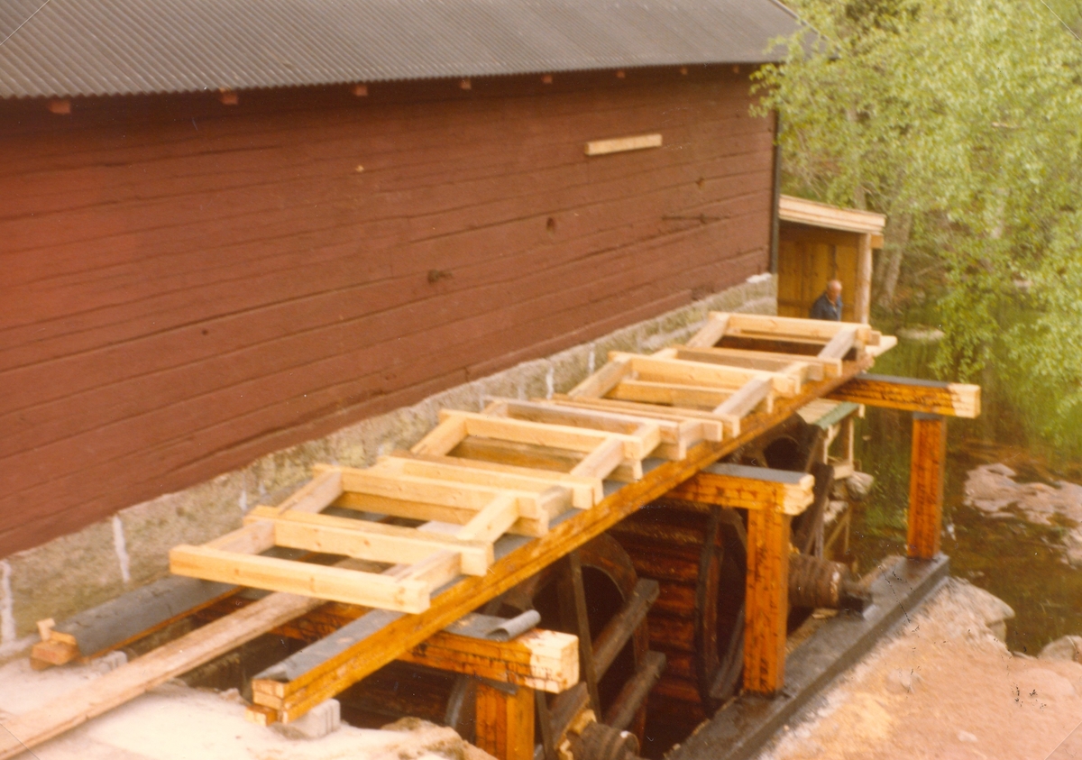 Vattenhjul på Stensfors kvarn under restaureringen 1976-1977.