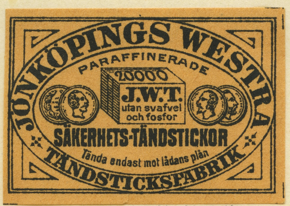 Tändsticksetikett från Jönköpings tändsticksfabrik, "Jönköpings Westra Tändsticksfabrik, Paraffinerade Säkerhets-tändstickor".