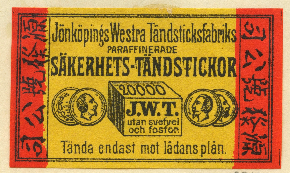 Tändsticksetikett från Jönköpings tändsticksfabrik, "Jönköpings Westra Tändsticksfabrik, Paraffinerade Säkerhets-tändstickor".