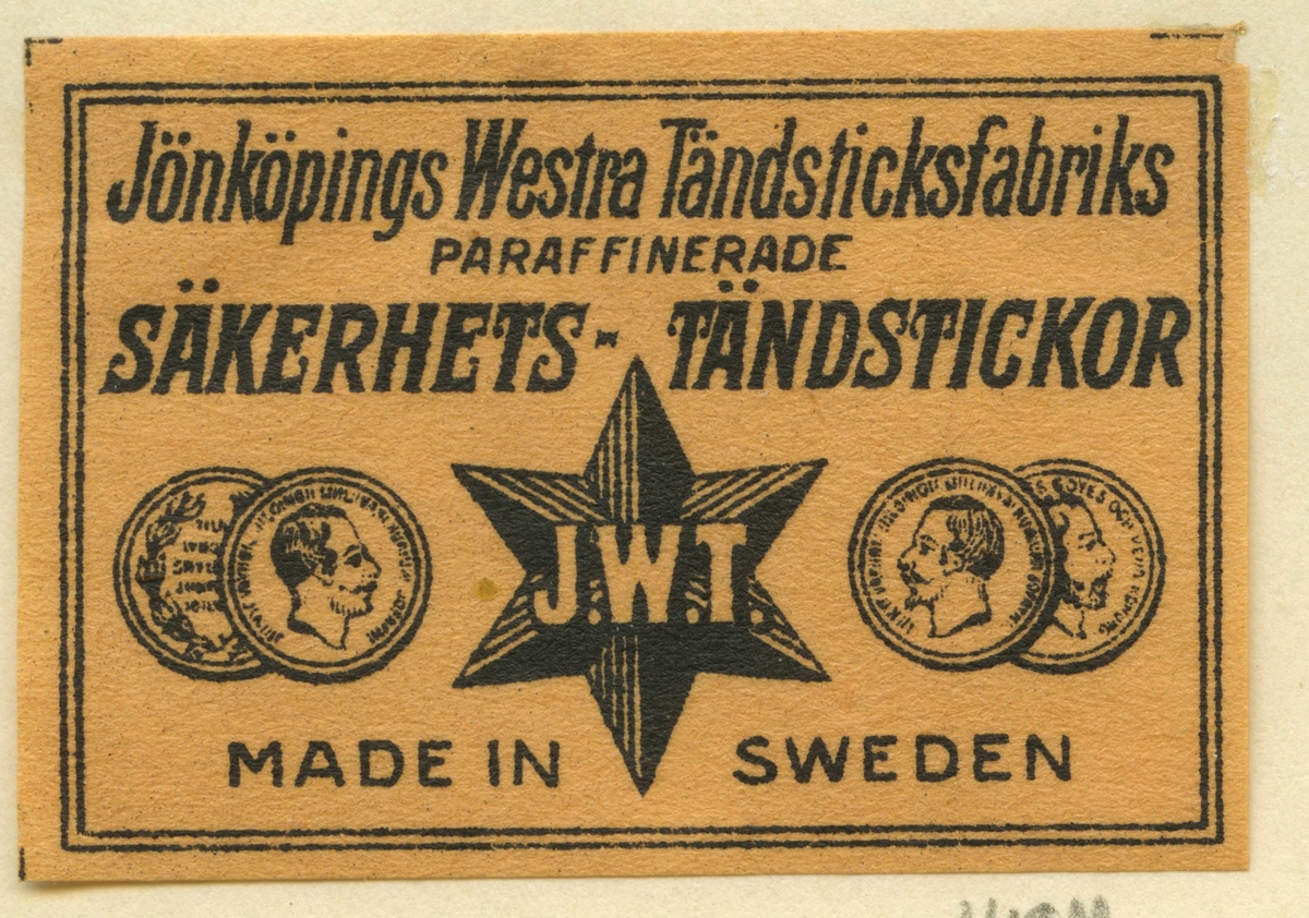 Tändsticksetikett från Jönköpings tändsticksfabrik, "Jönköpings Westra Tändsticksfabriks paraffinerade säkerhets-tändstickor, J.W.T."
