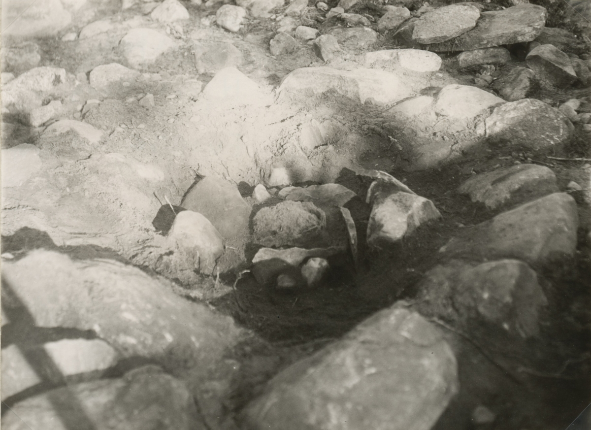 Rund, fylld stensättning med gravurna i stenkista från bronsåldern.