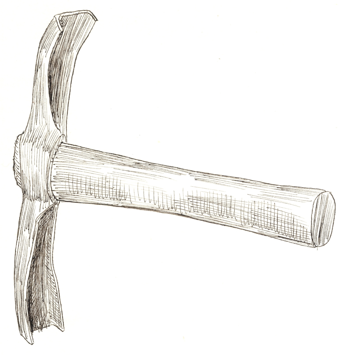 Teckning av en dubbelkäxla. Höjd: 27 cm. bredd: 4 cm, skaft: 20 cm.