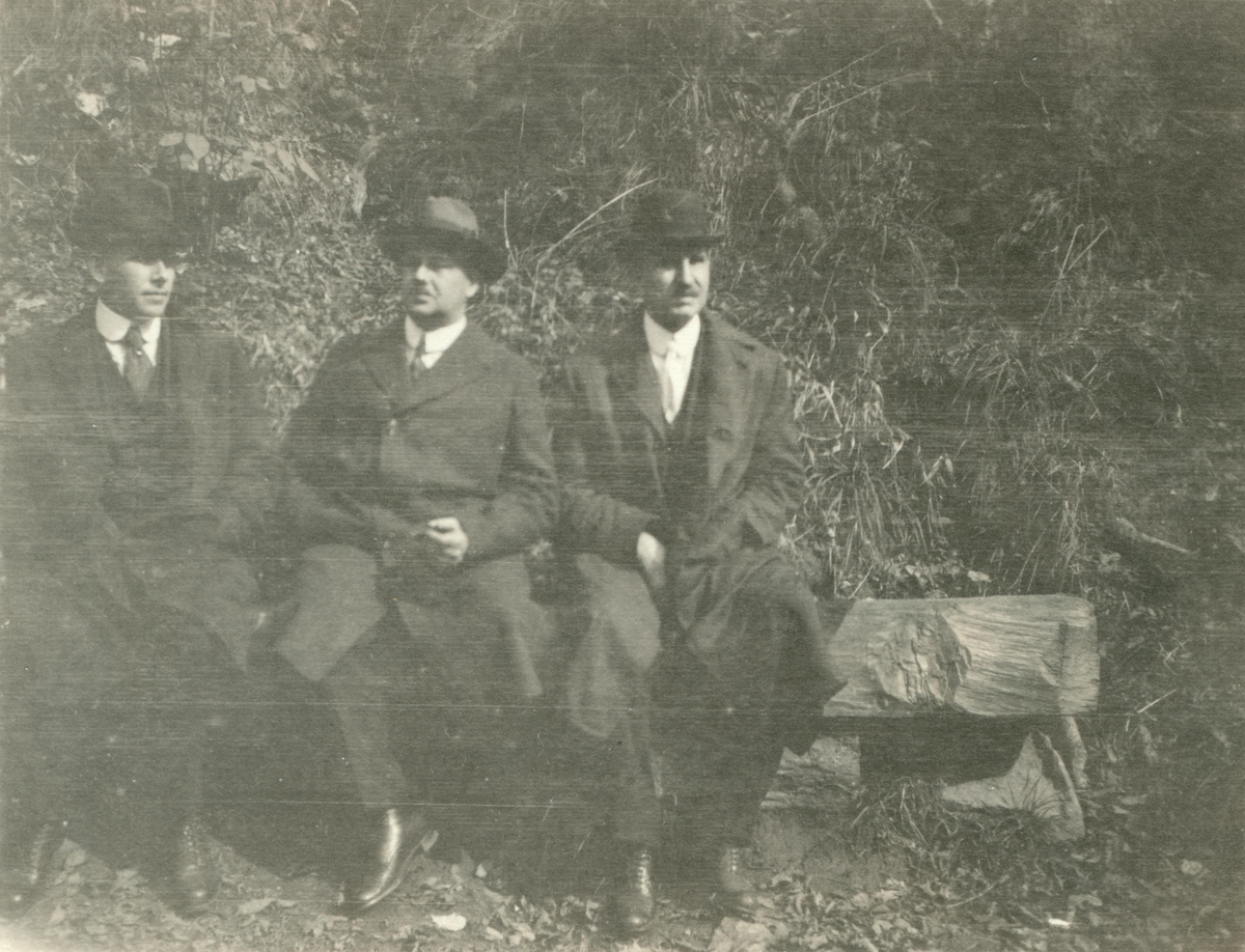 Karl Winell i Amerika. Tre män som sitter på en bänk.