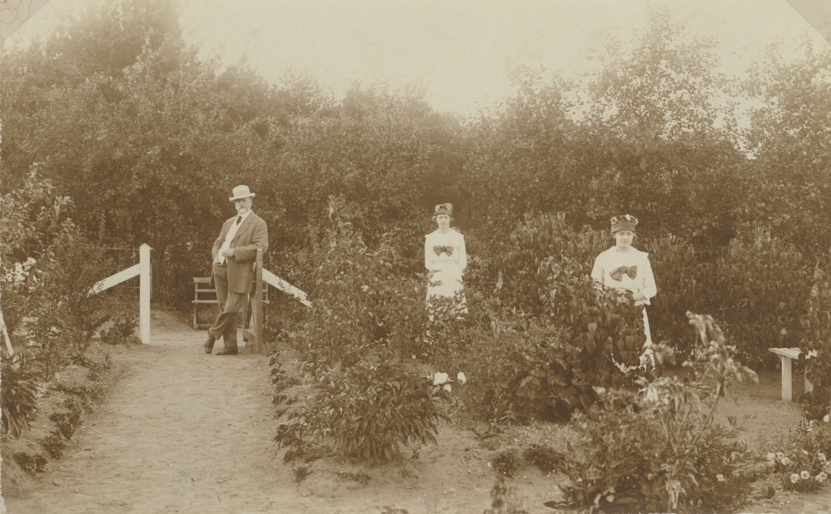 Pappa Karl Kullzén, tillsammas med tvillingdöttarna Signe och Rut Kullzén. Fadern född 22/1 1866 i Farhult, död 29/12 1928 i Kalmar. Fotografiet kan vara taget vid deras koloniträdgård i Tallhagen.