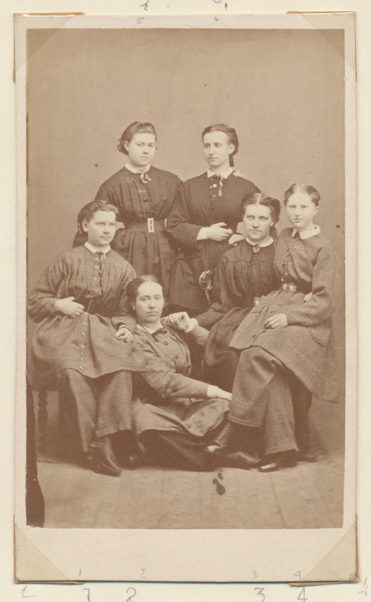 Kvinnlig gymnastiktrupp leda av gymnastiklärare Holmberg. Slutet av 1860 talet.