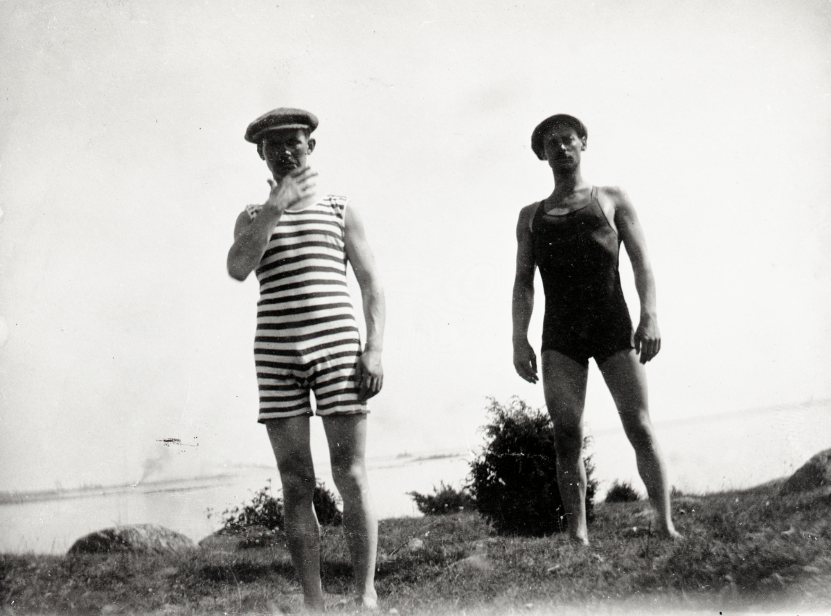 Två elever vid Kalmar brandkår vid badstranden, varav den ena är W Bergqvist som sedemera blev brandchef i Norrköping.