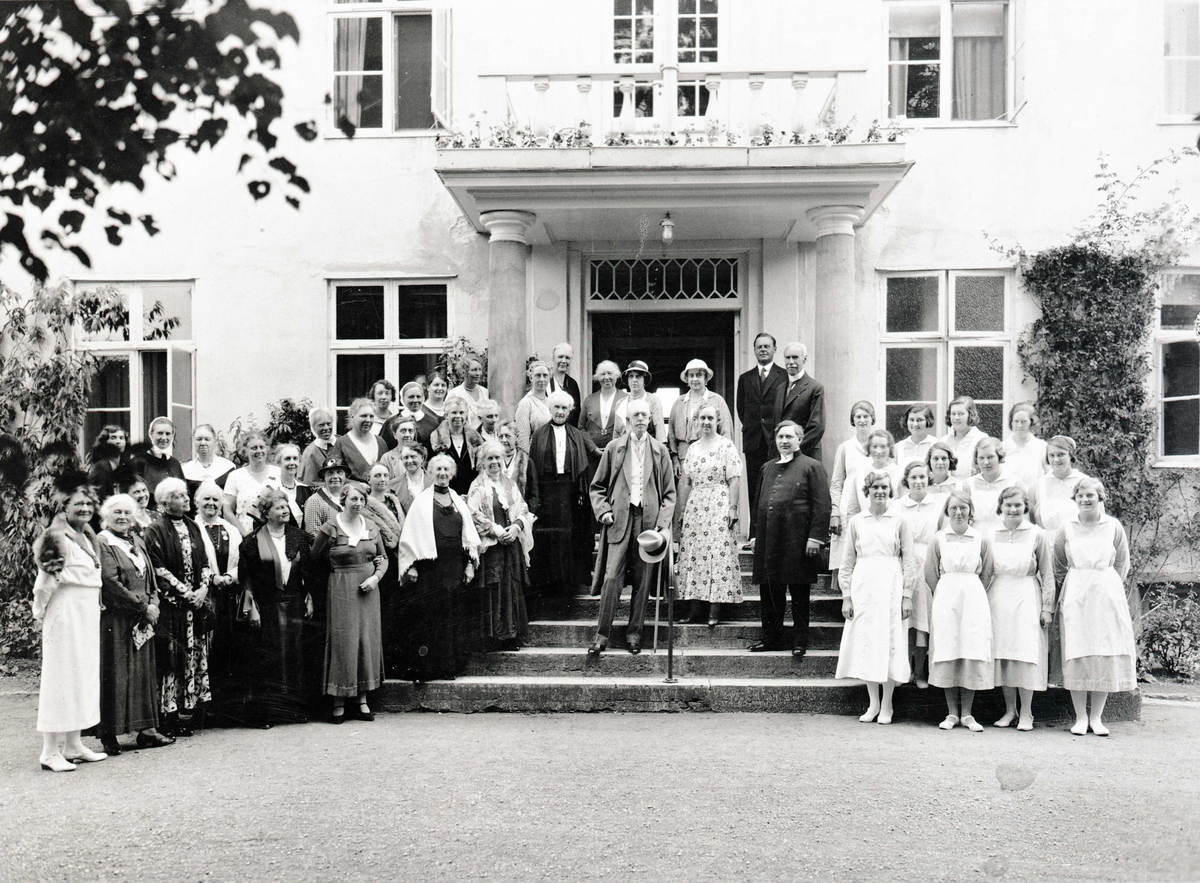Drottning Viktorias vilohem. Gruppbild med Gustav V, patienter och personal på trappan.