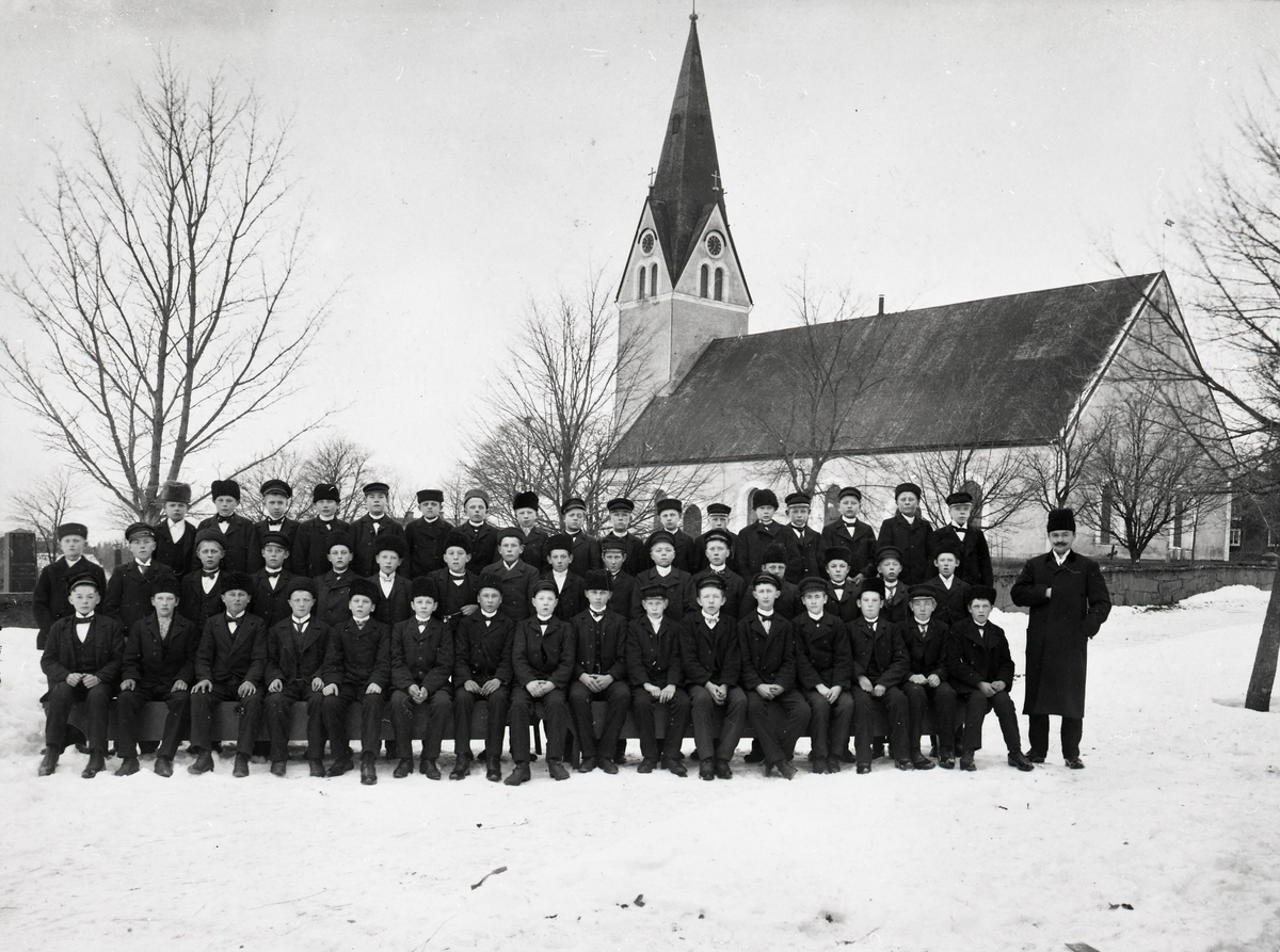 Konfirmandgrupp med kyrkan i bakgrunden.