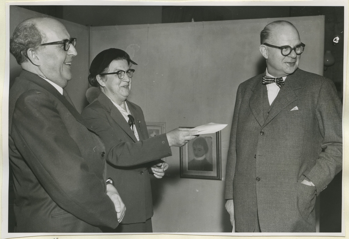 Ruben Wagnsson till höger, fru Wagnsson, chefredaktör Lindström, Västervik, till vänster. Vid utställningen på Konstmuseet 1957 (konst från norra länsdelen).