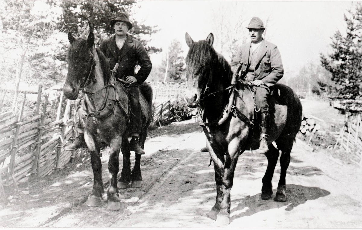 Två selade hästar med varsin herre som rider barbacka.