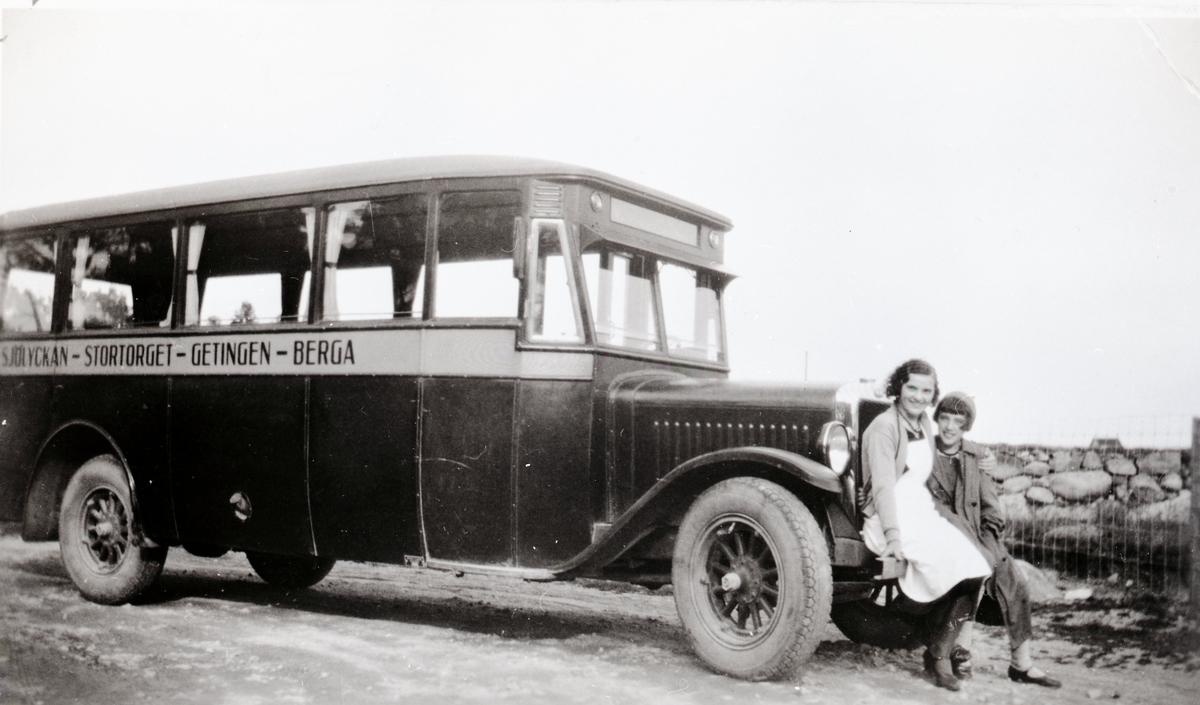 Emil Palmqvists buss; blå linjen, Volvo 1931-års modell för tjugotvå personer. kör linjen Sjölyckan-Stortorget-Getingen-Berga.