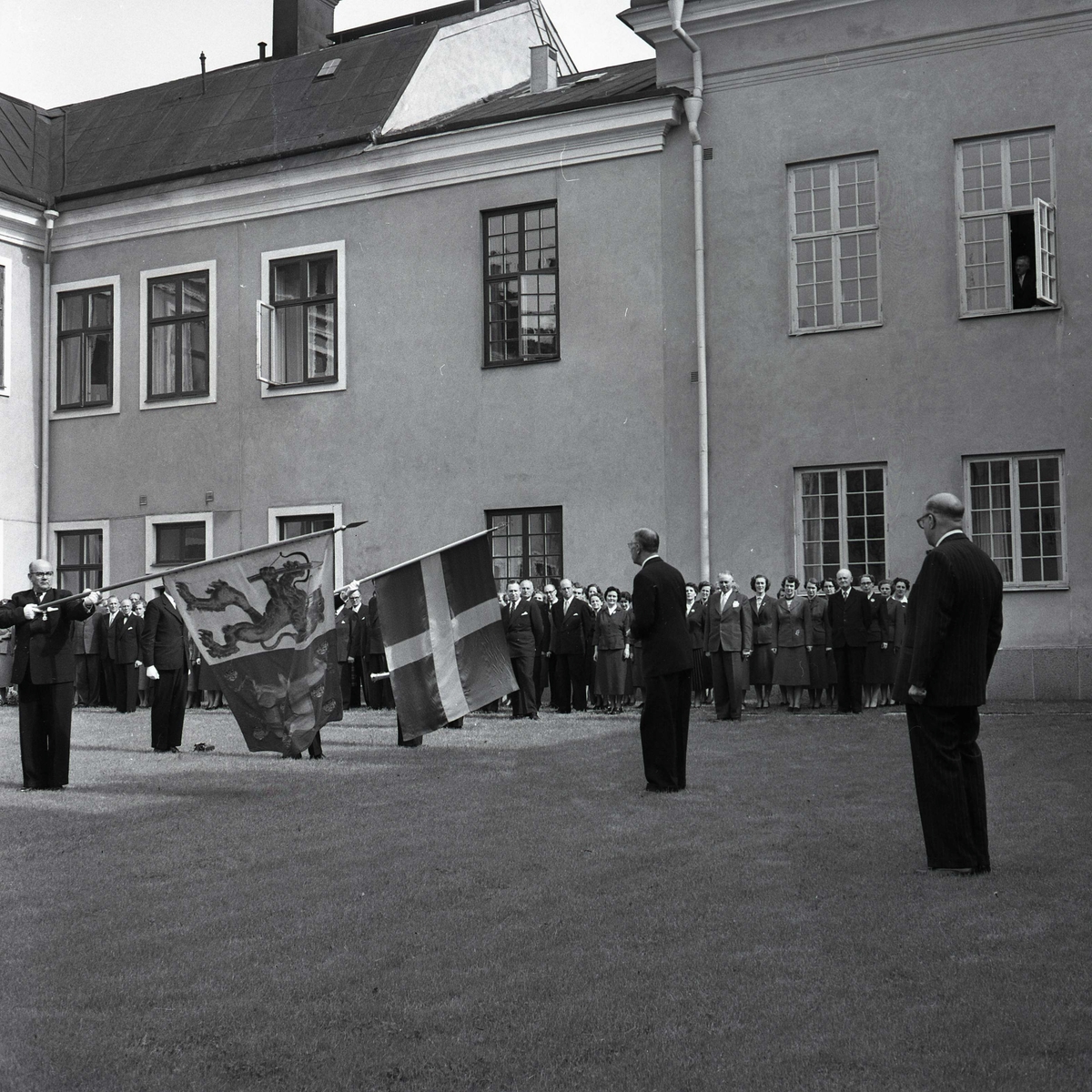 Gustaf VI Adolfs Eriksgata i Kalmar län 15 - 18 maj 1954. Länsstyrelsens personal samlad på residensets gård. Till höger landshövding Wagnsson.