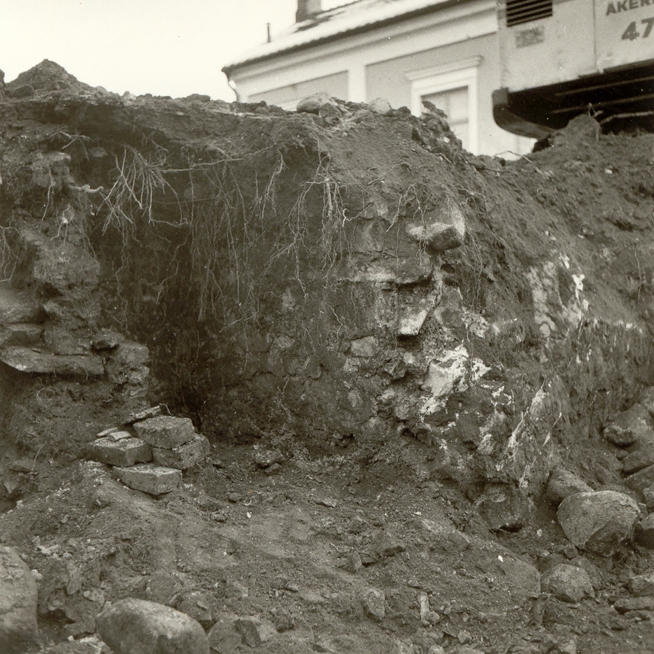 Eldstad med sekundär tegelvägg från nord-nordost.