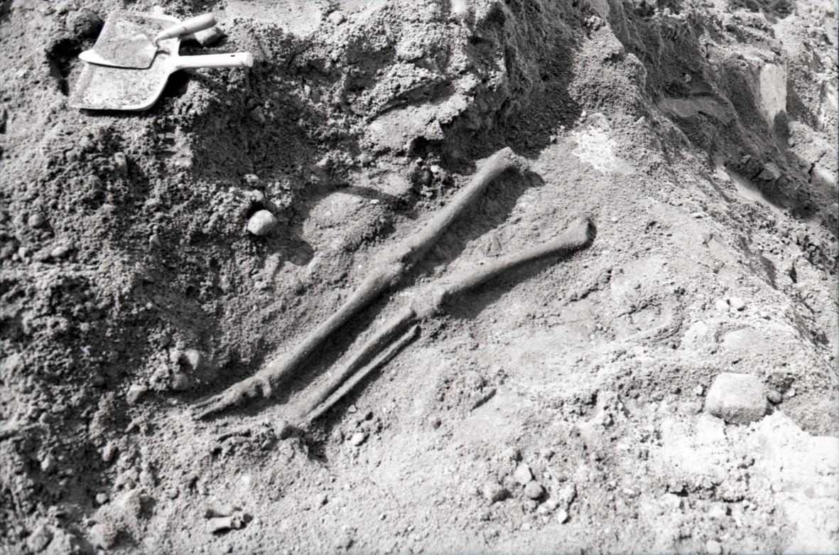 Arkeologisk utgrävning inför utbyggnaden av hotell Witt. Skelettdelar in situ.