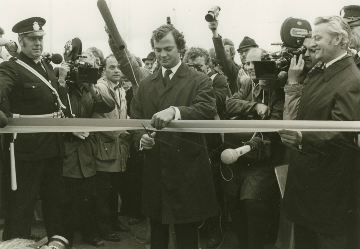 Titel: Kung Carl XVI Gustaf (då kronprins) klipper band vid tillfället för invigningen av Ölandsbron i september 1972.