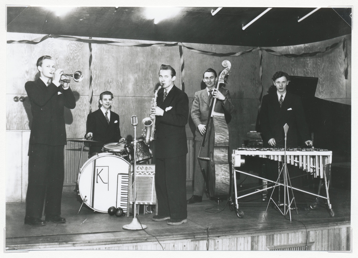 King Kellers orkester. Från vänster: Dan-Åke Olwéus - trumpet, Karl Friberg - trummor, Harald Gamme - altsax, Jan Albien - kontrabas, Sven-Olof Lönngren - vibrafon.