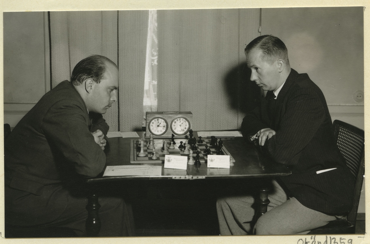 Schackkongressen i Kalmar 1938. Spelaren till vänster kan vara Gideon Ståhlberg. Spelaren till höger Erik Lundin.