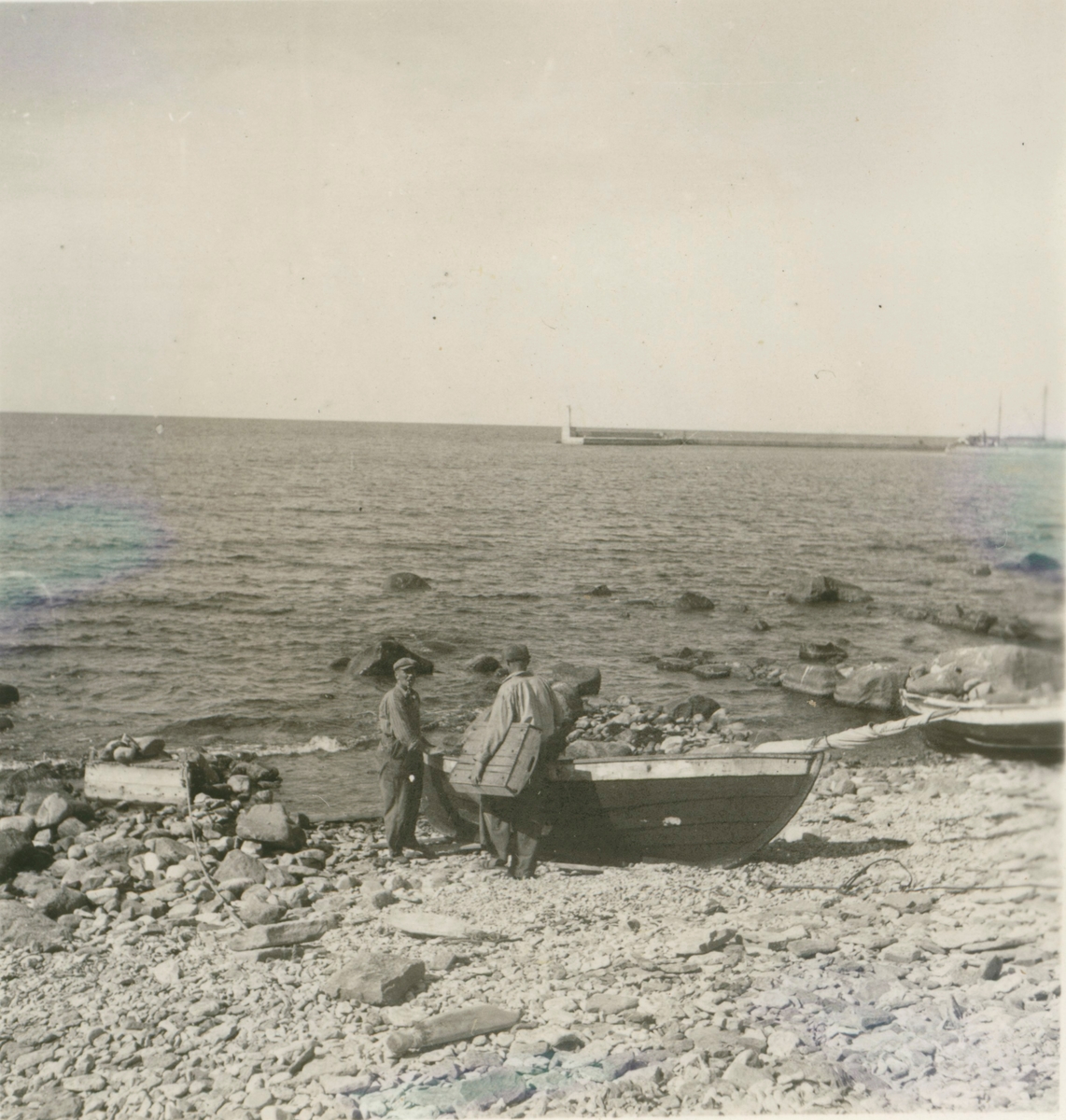 Kåsar vid stranden. Fiskebåt drages ut. I fören ligger råseglet hoprullat.