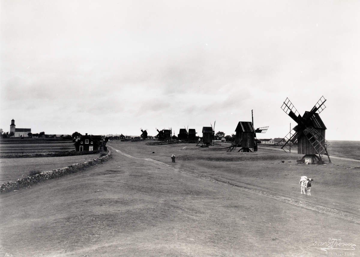 Väderkvarnar med kyrkan i bakgrunden. Sett från söder.