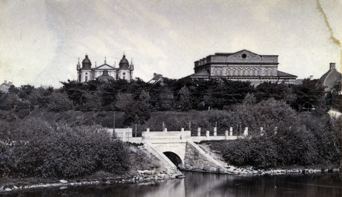 Vy över Kvarnholmen från lokstallarna. I bakgrunden syns domkyrkan och teatern.