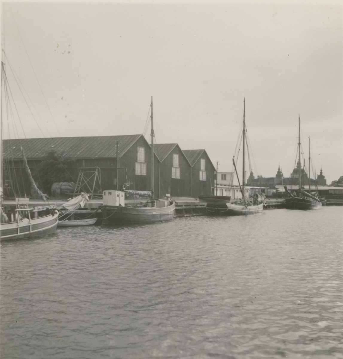 Hamnmagasin och segelfartyg vid Kalmar hamn.