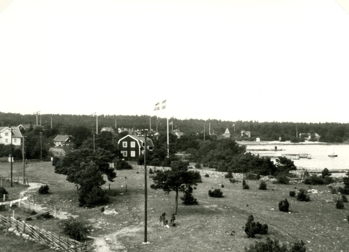 Vy från gamla fyrhuset mot nordväst. Längre ut, längst upp till höger ligger fiskehamnen. Längst till vänster lotsen Lennart Ströms hus.