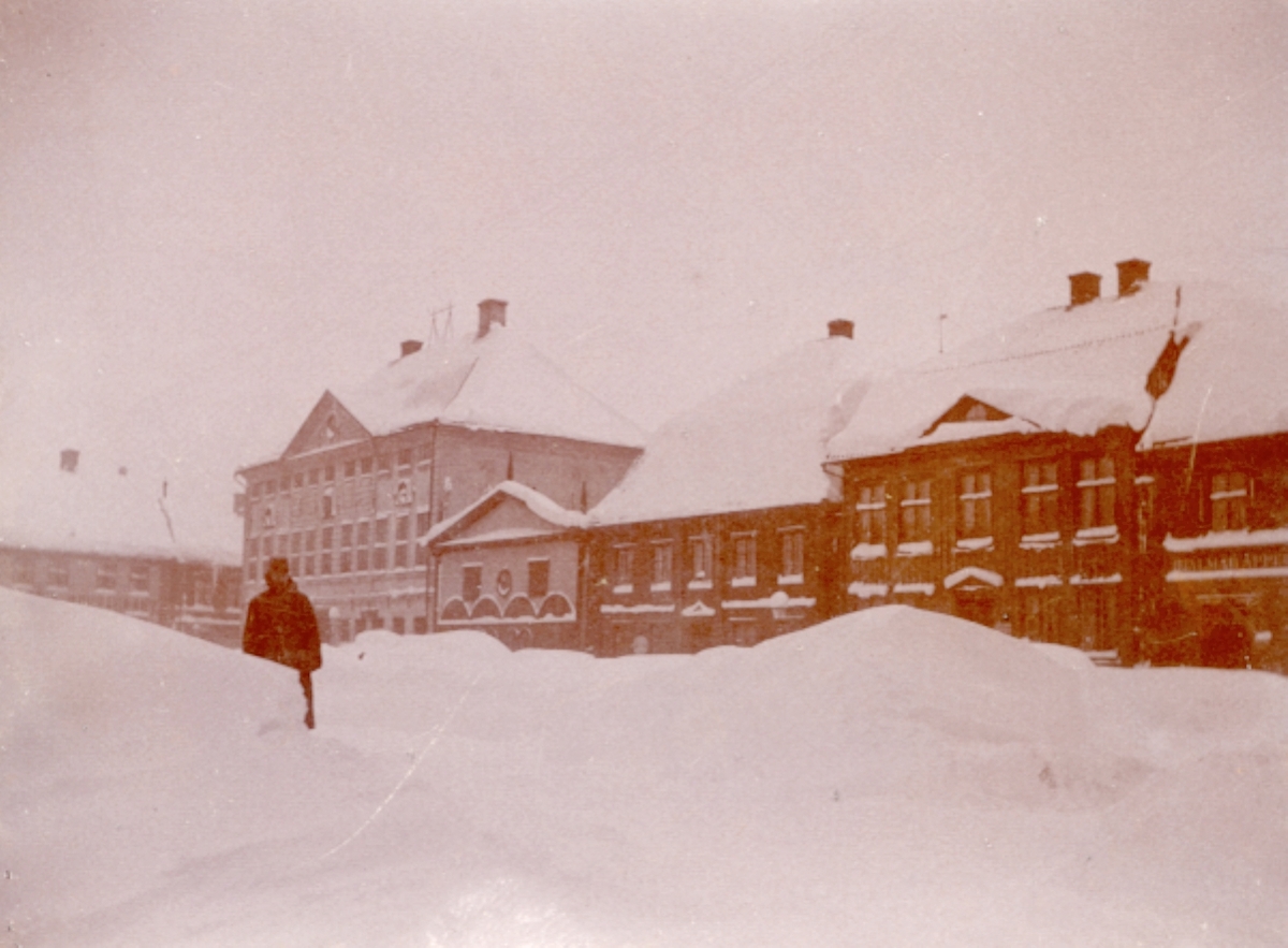 Stortorget i vinterskrud. Det låga huset är den gamla köttbesiktningsbyrån, i folkmun kallad Synagogan.